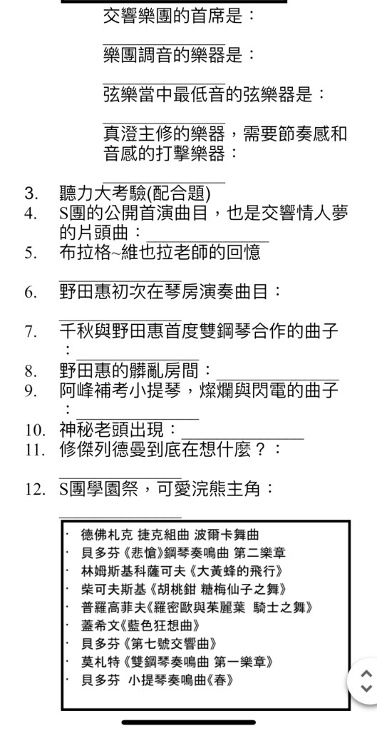 結合日劇情節,學生真的很能沈浸在音樂中,也讓音樂老師成功的 置入性行銷!拓展學生曲目知識量。(尤其國中音樂課本篇幅有限,諸如貝多芬第七號、普羅高菲夫芭蕾舞劇配樂,是鮮少接觸到的) (🔗點下去👉15年前嗡嗡的交響情人夢學習單有人要嗎😅)
