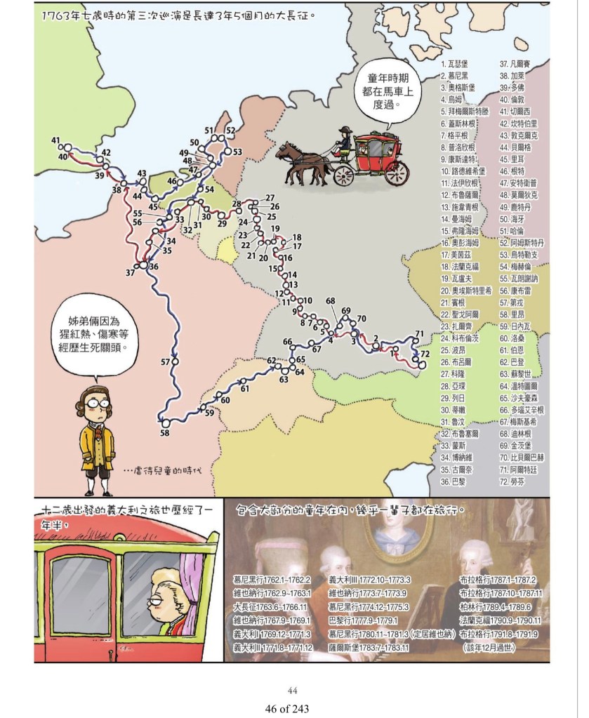 3.音樂神童莫札特七歲時在馬車上的第三次歐洲巡演大長征,歷經3年5個月,走遍72個城市。