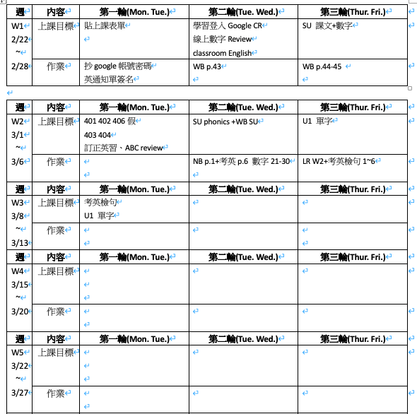 1. 上課進度表